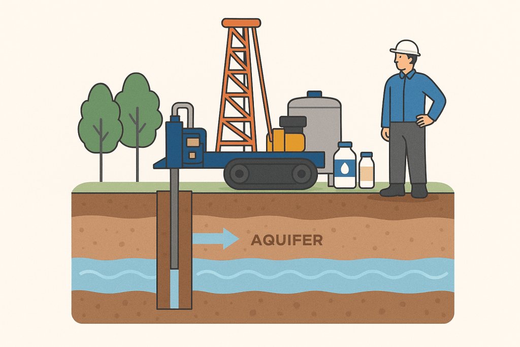建物への水供給や災害時の非常用水確保を目的とした井戸掘削工事に対応しています。事前の地質調査から施工、完成後の水質チェックまで一貫して対応。